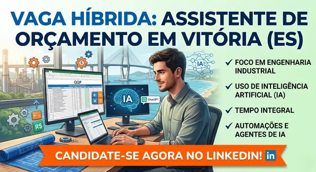Se você busca uma oportunidade na área de engenharia, com uso de tecnologia e inteligência artificial, a vaga de Assistente de Orçamento em Vitória, Espírito Santo, pode ser perfeita para você. O trabalho é híbrido, em tempo integral, e oferece a chance de atuar diretamente no planejamento e controle de custos de projetos industriais.