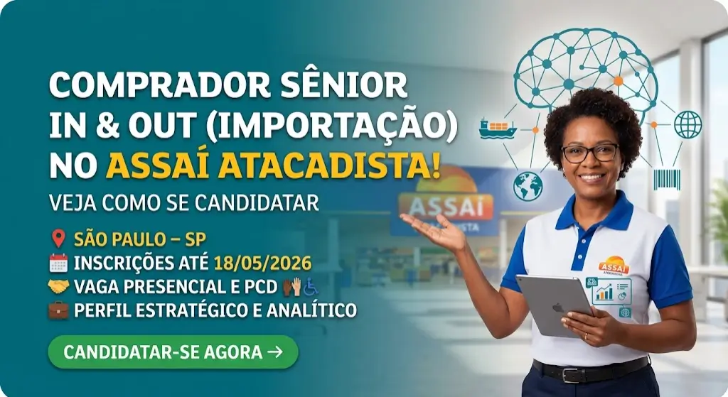 O Assaí Atacadista, empresa reconhecida como uma das marcas mais valiosas do setor de atacado de autosserviço no Brasil, está com processo seletivo aberto para Comprador Sênior In & Out com foco em importação. A vaga é presencial, com atuação em São Paulo (SP), e também está aberta para pessoas com deficiência (PwD).