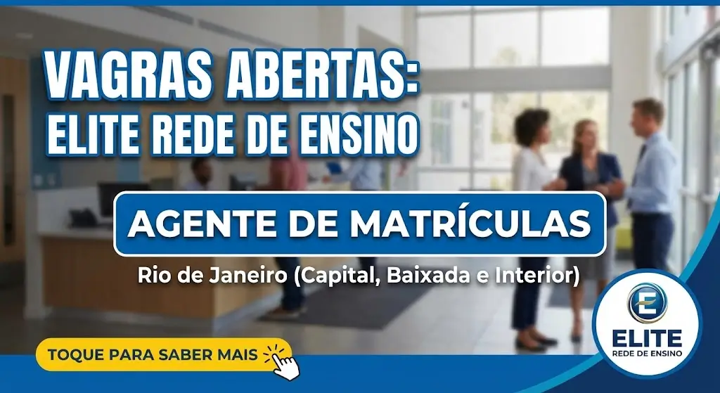 A Elite Rede de Ensino, uma instituição educativa com mais de 20 anos de experiência, está com vagas abertas no estado do Rio de Janeiro. Entre as oportunidades disponíveis destacam-se cargos como Agente de Matrículas (Enrollment Agent), Inspetor de Alunos, Auxiliar de Serviços Gerais, entre outros.
