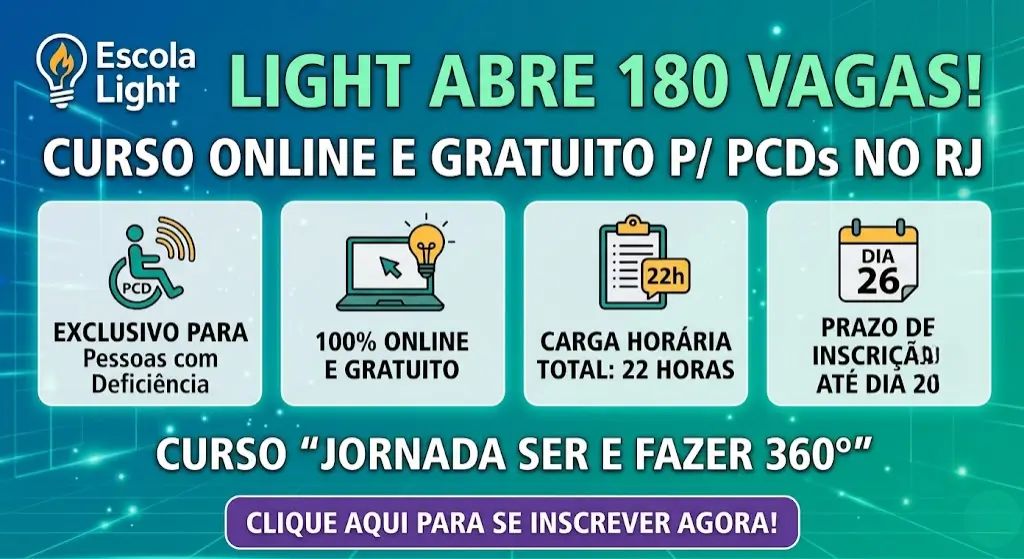 Não é todo dia que aparece uma oportunidade assim. A Escola Light — braço educacional da empresa de energia que atende boa parte do Rio de Janeiro — lançou um programa chamado Jornada Ser e Fazer 360°, com 180 vagas gratuitas para Pessoas com deficiência que queiram se qualificar e melhorar as chances no mercado de trabalho.