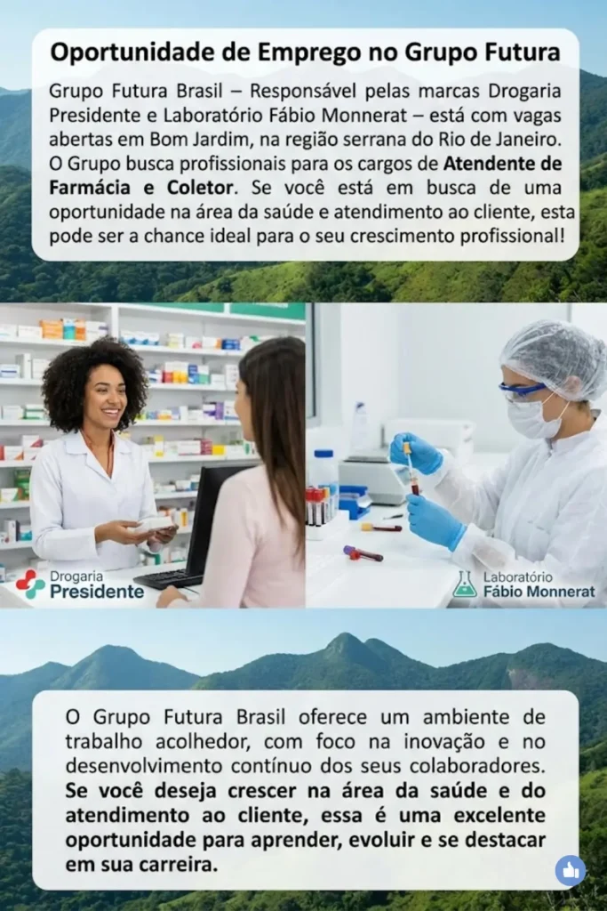 Grupo Futura Brasil – Responsável pelas marcas Drogaria Presidente e Laboratório Fábio Monnerat – está com vagas abertas em Bom Jardim, na região serrana do Rio de Janeiro. O Grupo busca profissionais para os cargos de Atendente de Farmácia e Coletor. Se você está em busca de uma oportunidade na área da saúde e atendimento ao cliente, esta pode ser a chance ideal para o seu crescimento profissional!