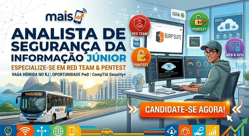 A Mais.Mobi, empresa inovadora de mobilidade urbana, está com uma oportunidade aberta para Analista de Segurança da Informação Júnior. Se você busca iniciar ou consolidar sua carreira em segurança ofensiva, pentest e Red Team, essa é a chance de trabalhar em projetos que transformam o transporte e a tecnologia das cidades.