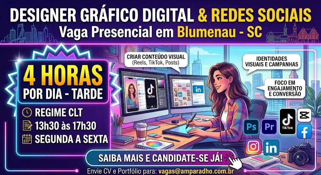 Designer Gráfico Digital Redes Sociais: Vaga Presencial em Blumenau com 4h por Dia