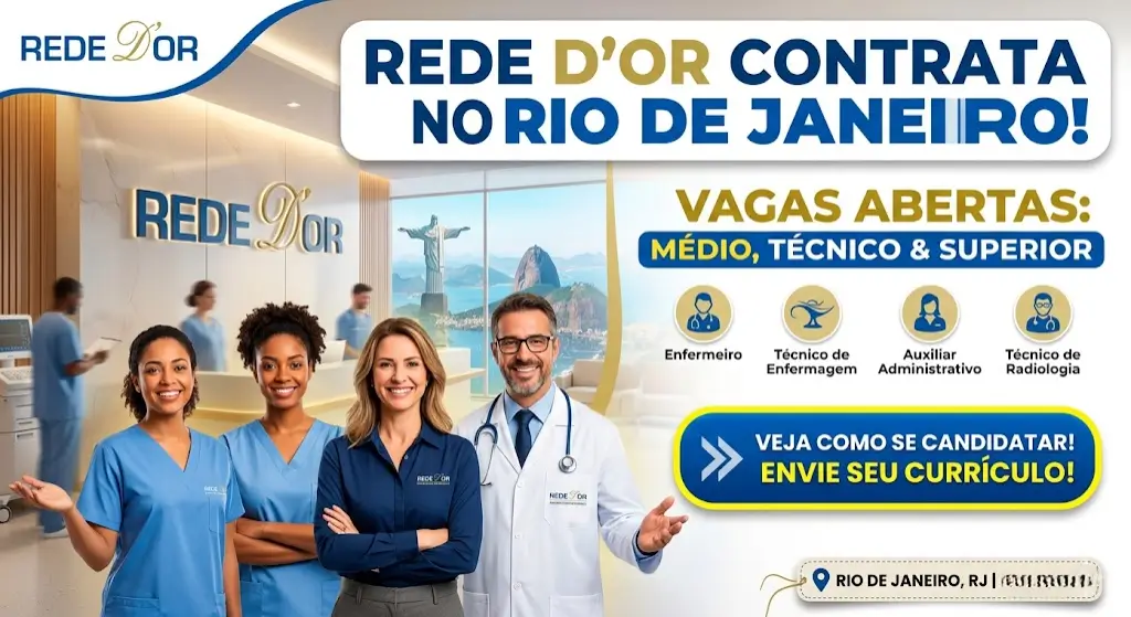 Conteúdo informativo baseado em dados públicos divulgados pela Rede D’Or. Para informações atualizadas sobre requisitos e prazos, acesse o portal oficial em trabalheconosco.vagas.com.br/rededor.