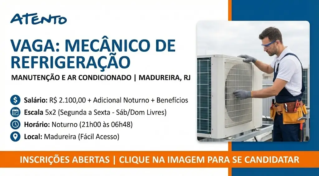 A Atento está com oportunidade aberta para Mecânico de Manutenção em Refrigeração e Ar Condicionado na unidade de Madureira, no Rio de Janeiro. A vaga é para contratação em regime CLT, com atuação presencial, voltada a profissionais que desejam trabalhar com manutenção técnica em um ambiente corporativo estruturado e com possibilidade de crescimento profissional.