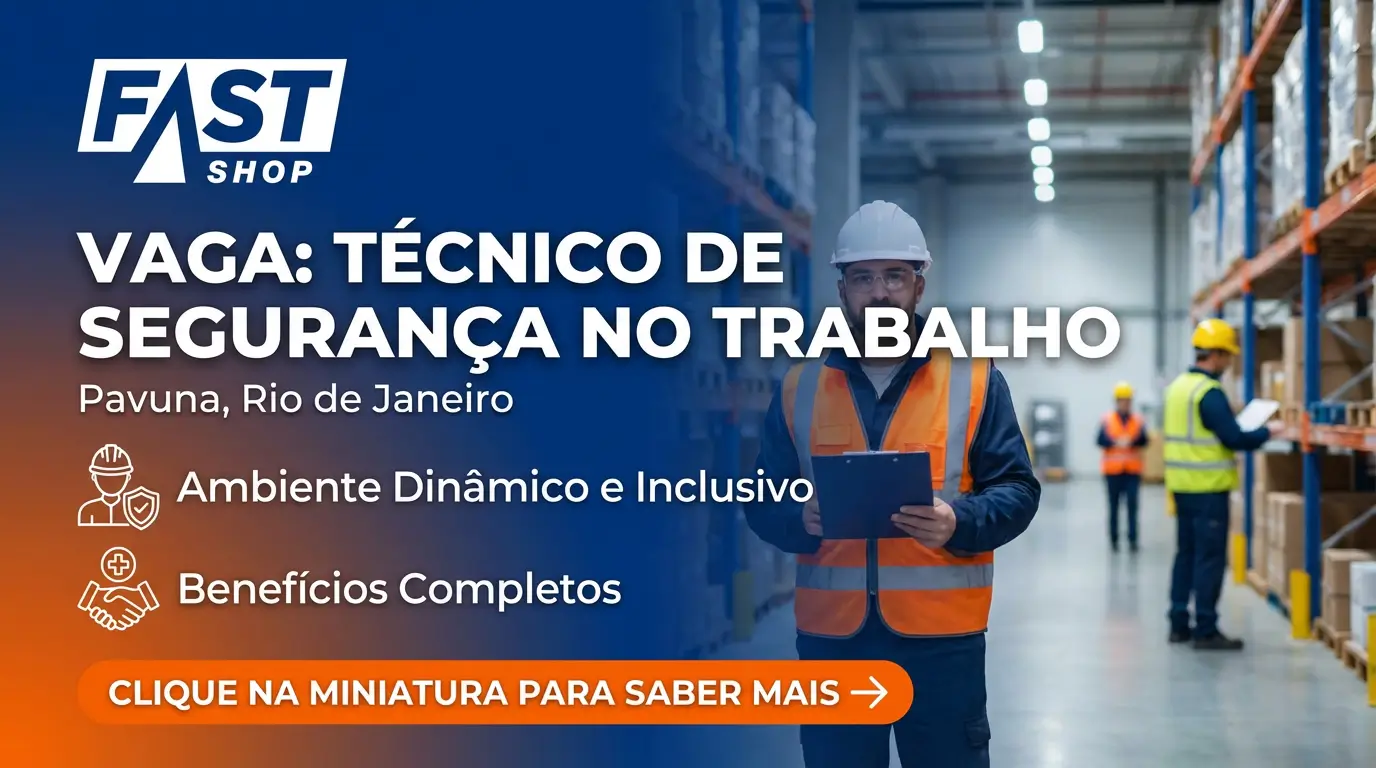 A Fast Shop está a recrutar um Técnico de Segurança no Trabalho para a sua unidade em Pavuna, Rio de Janeiro. Esta é uma oportunidade para quem procura crescer profissionalmente num ambiente dinâmico, inovador e inclusivo, com fortes valores de segurança e bem-estar para os colaboradores.