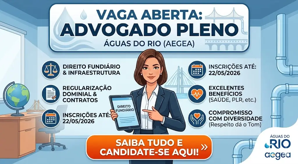 As inscrições estão abertas até 22 de maio de 2026, e os candidatos podem se inscrever diretamente pelo link oficial: Vaga Advogado Pleno Águas do Rio.