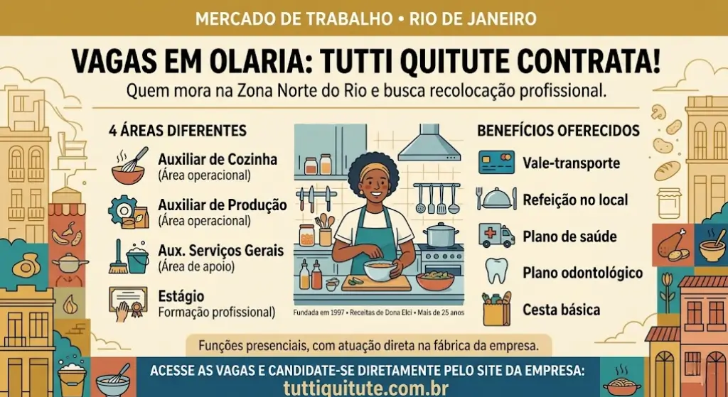 As funções são presenciais, com atuação direta na fábrica da empresa. Para quem mora nas redondezas de Olaria ou em bairros próximos da Zona Norte, a localização pode ser um ponto a favor na hora de decidir se candidatar.