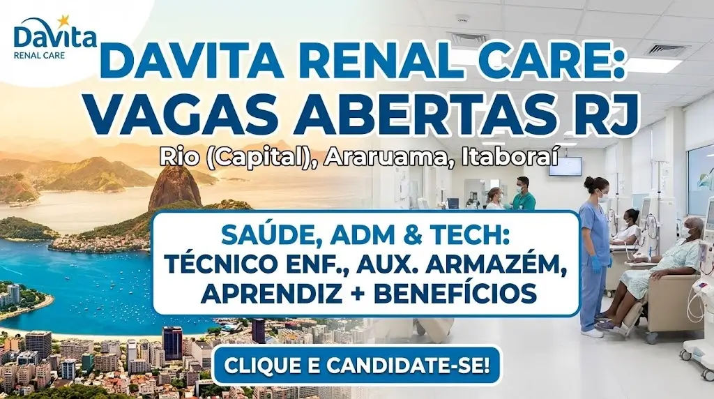 A DaVita Renal Care, uma das líderes mundiais no tratamento de doenças renais e integrante da prestigiada lista Fortune 500®, anunciou novas oportunidades de emprego no estado do Rio de Janeiro. Se está à procura de um trabalho com propósito e oportunidades de crescimento, esta pode ser a sua chance. A empresa está a recrutar para várias funções nas cidades do Rio de Janeiro (RJ), Araruama e Itaboraí, com ofertas em áreas como saúde, administração e tecnologia.